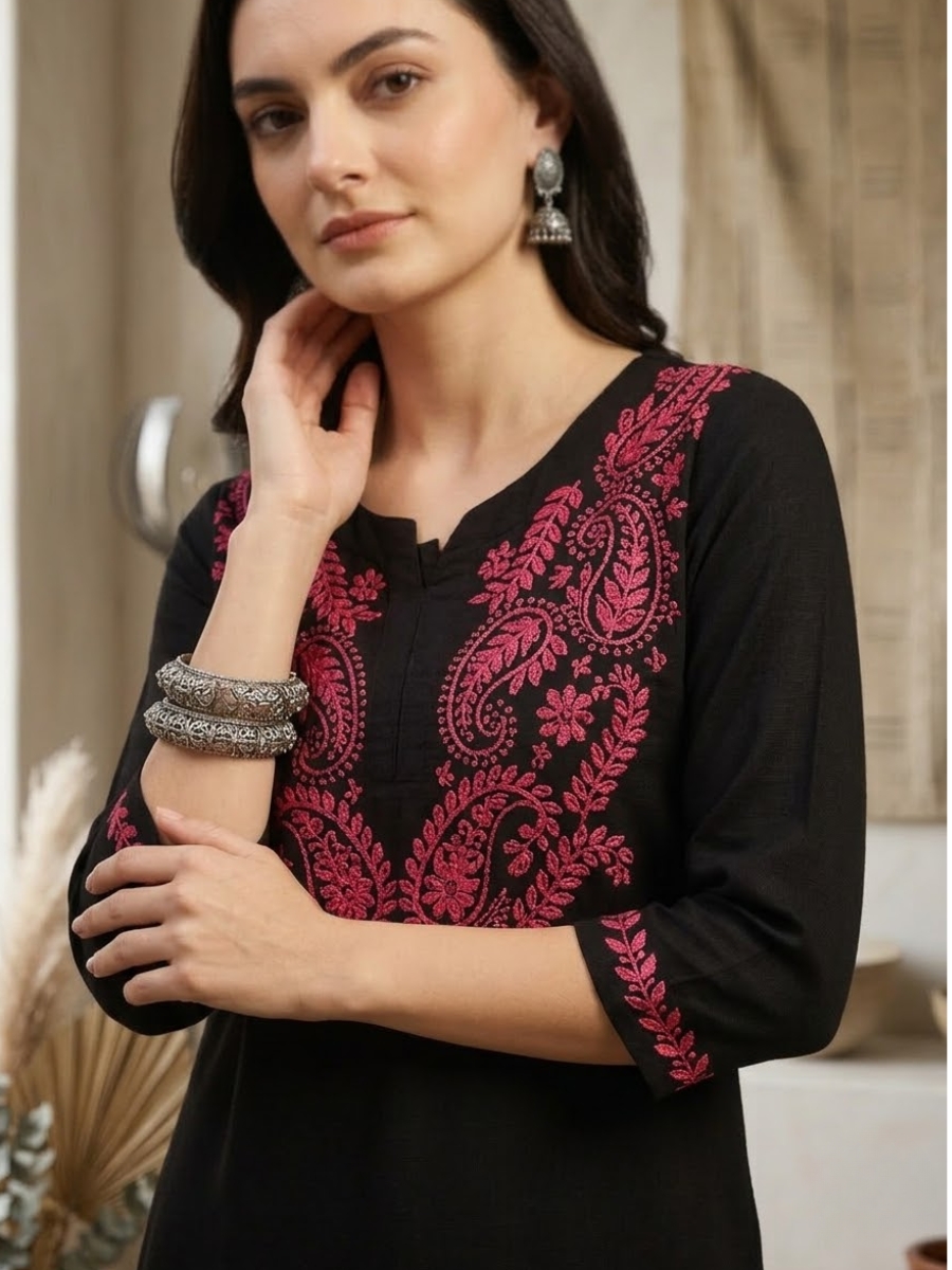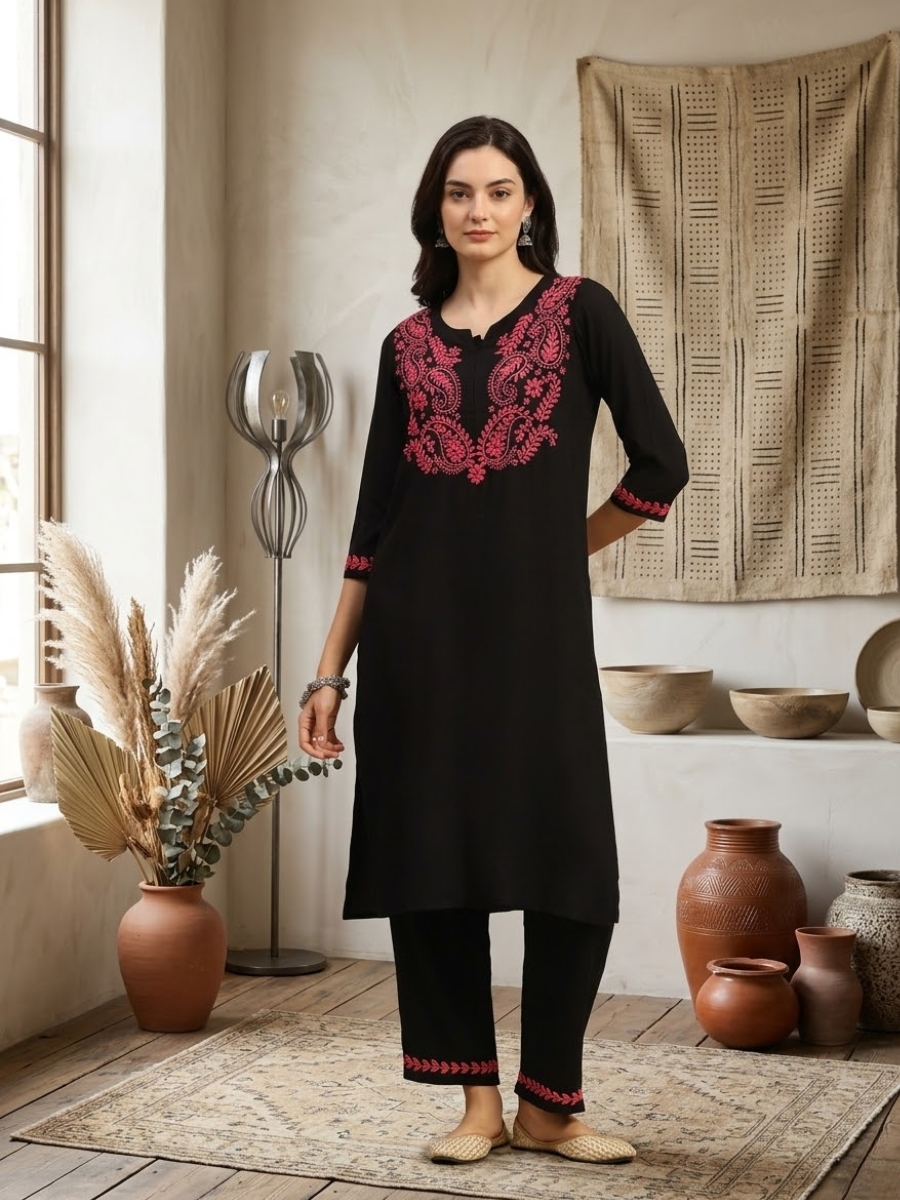Pair this black embroidered rayon kurta set with silver oxidized jewelry and juttis or kolhapuris for a classic ethnic look. Add a light dupatta for festive occasions.